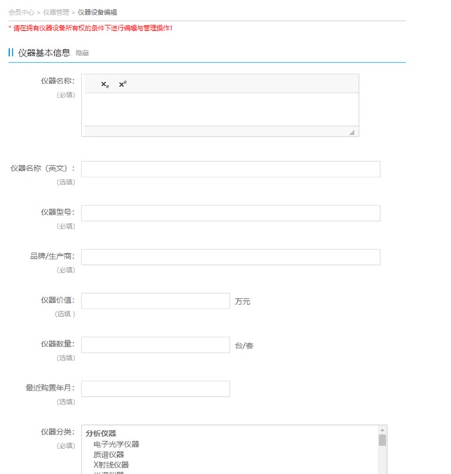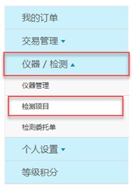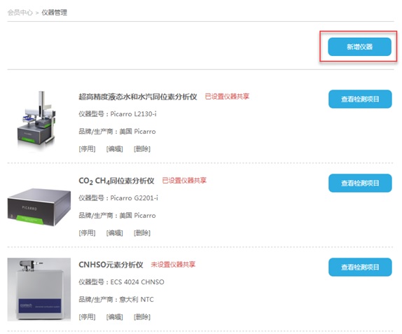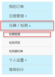 登录后,点击画面左部的会员菜单:“仪器 / 检测”→“仪器管理”,进入仪器管理画面:
