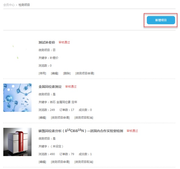 点击画面左部的会员菜单:“仪器 / 检测”→“检测项目”,进入检测项目管理画面: