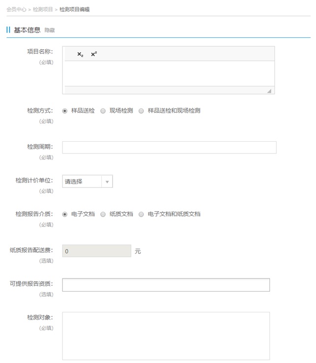 在检测项目管理画面,点击【新增项目】按钮,进入检测项目发布画面: