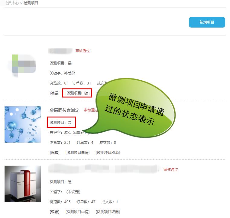 在您追加完成的检测项目下面,点击【微测项目申请】选项,进入微测项目申请画面: