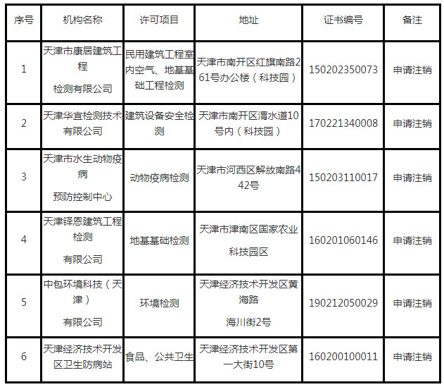 根据《中华人民共和国行政许可法》和《检验检测机构资质认定管理办法》的规定,决定对天津市康居建筑工程检测有限公司、天津华宜检测技术有限公司、天津市水生动物疫病预防控制中心、天津铎恩建筑工程检测有限公司、中包环境科技(天津)有限公司、天津经济技术开发区卫生防病站资质认定证书予以注销。从即日起,被注销机构的证书和认证标志停止使用,不得向社会出具具有证明作用的检验检测数据、结果。特此通告附件:注销资质认定证书的机构信息