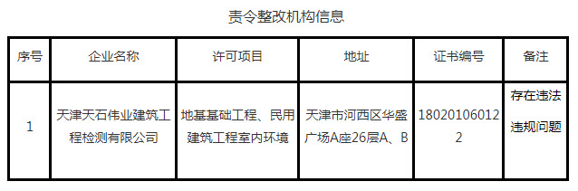 天津市市场监督管理委员会关于责令天津天石伟业建筑工程检测有限公司整改的通告