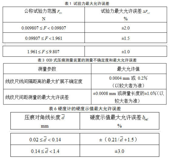 该项新标准提出的计量性能包括基本性能、试验力、压头、压痕测量装置、示值误差及示值重复性这几方面的内容。其中,试验力最大允许误差如下表1所示,CCD式压痕测量装置的测量不确定度和最大允许误差如下表3所示,硬度计的硬度示值最大允许误差如下表6所示: