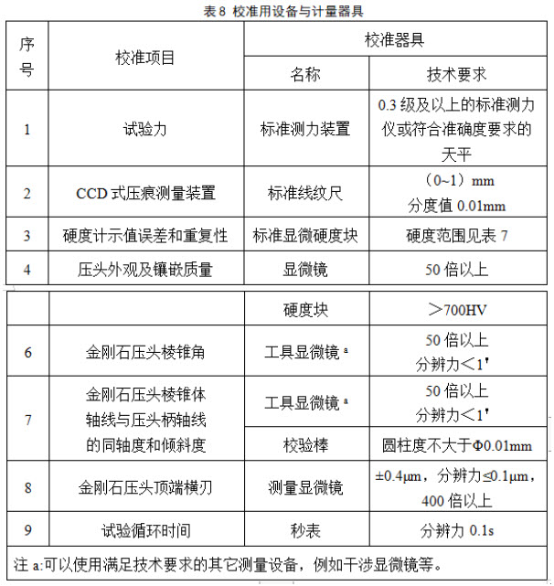 仪器校准的环境条件有:1.硬度计应在(23±5)℃和相对湿度不超过70%的环境条件下进行校准,并应在校准记录和校准证书中注明。2.校准硬度计时,周围环境应清洁,无明显振动,无腐蚀性气体。校准用设备与计量器具如表8所示: