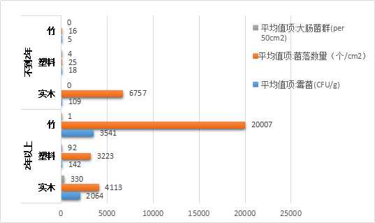 ▲旧砧板霉菌、大肠菌群、菌落总数2年以上和不到2年对比 (由于样本量有限,仅供参考)