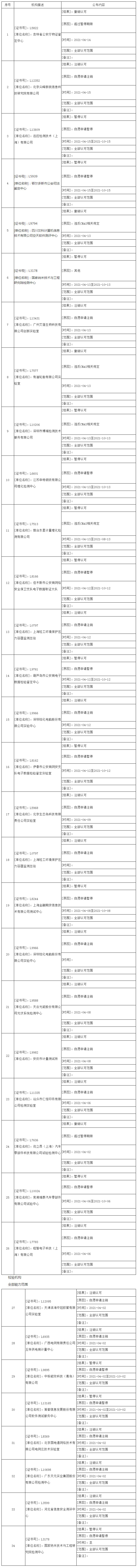 中国合格评定国家认可委员会今日发出公告,2021年4月上半月共计38家机构暂停撤销注销认可资格。
