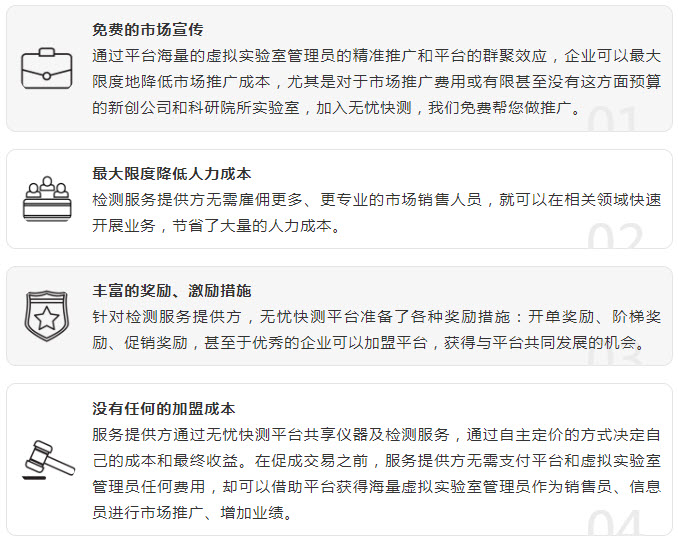 作为检验检测行业的线上服务平台(http://www.51kuaice.com),无忧快测始终致力于打造线上仪器资源共享和检测服务分享平台,为检测服务供给方和需求方搭建一座线上沟通的桥梁,足不出户即可完成信息发布、需求承接等工作,平台开发的资源共享池与虚拟云实验室将帮助第三方检测机构、实验室减少线下对接的时间成本和人员成本,低成本、高收益,助力检验检测行业实现云办公、云对接、云推广的全新运营模式。