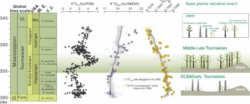 图1.早石炭亚纪杜内期碳、氧、锶同位素变化与种子植物演化之间的关系