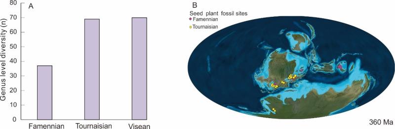 图2.晚泥盆世-早石炭亚纪种子植物属级多样性和分布范围变化