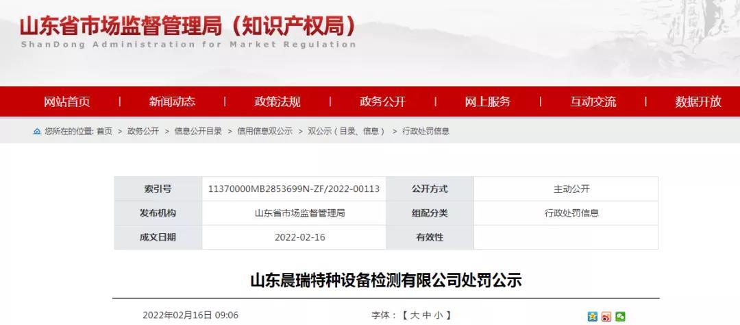 近日,山东省市场监督管理局对行政处罚案件信息进行公示,山东晨瑞特种设备检测有限公司因未按照安全技术规范的要求办理许可证变更手续以及不再符合安全技术规范要求的条件继续从事特种设备检验检测,被责令改正违法行为,罚款12万元,没收违法所得4160元。
