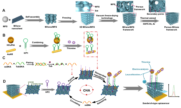 针对此类问题,在安徽省高校协同创新计划项目、安徽省科技重大专项的资助与支持下,课题组研究人员开发出高灵敏度的适配体传感器,他们利用具有优异电子传输通道的多级孔结构框架作为传感材料,同时选择具有高的电催化效应的金属纳米探针作为信号放大器,构建出应用于血液中凝血酶精准检测的高灵敏度适配体传感器。