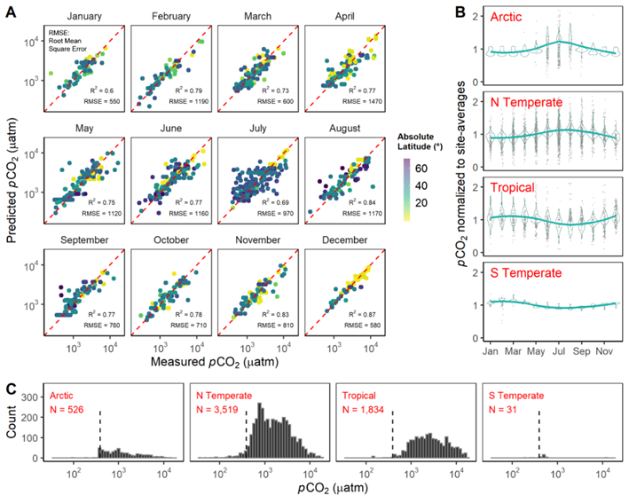 图1. 全球河流直测 p CO2及不同气候带月尺度变化模型预测
