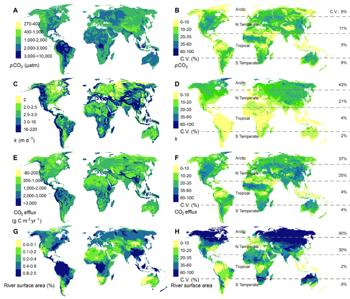 图2. 全球河网pCO2、气体传输速率( k )、水面逸散通量、河网流域面积分布及在不同气候带的变异系数