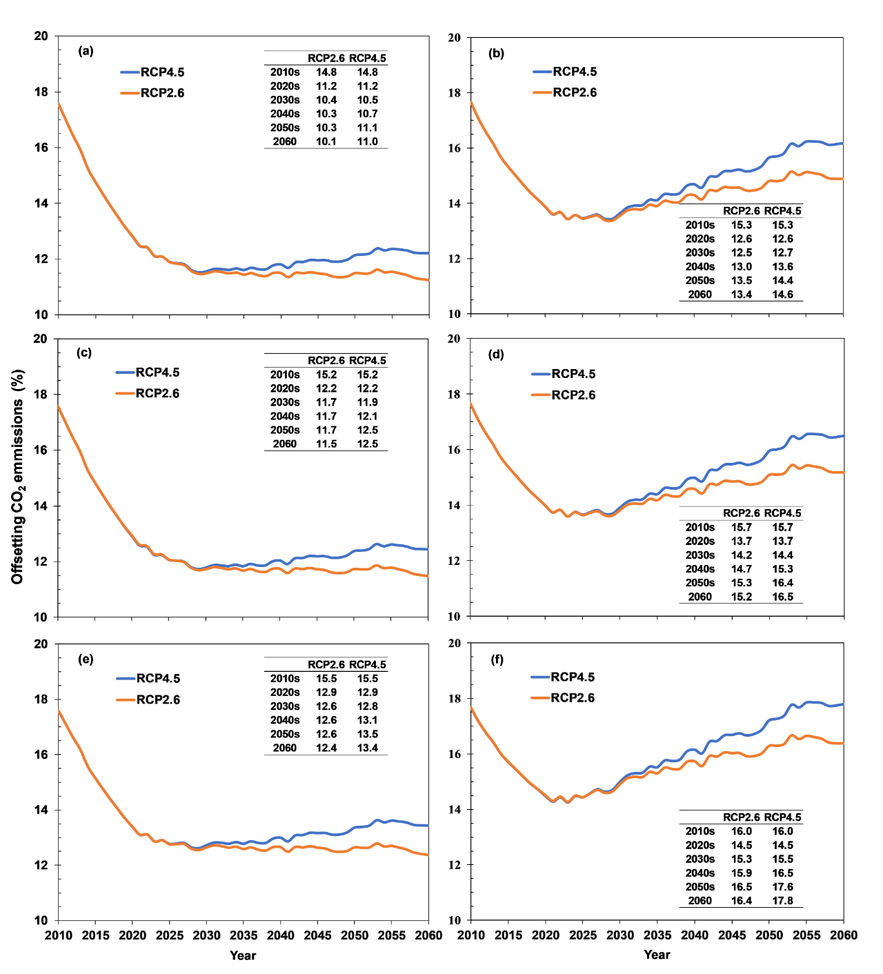2010-2060年中国陆地生态系统碳汇抵消能源二氧化碳排放的比例. 图(a、c、e)为基准情景,图(b, d, f)为基准情景+目标管理. 能源二氧化碳排放包括三个情景,图(a, b)为参考情景,图(c, d)为政策情景I,图(e, f)为政策情景II.
