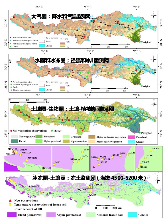 2017年以来,研究团队逐步构建了覆盖大气圈、水圈、冰冻圈、土壤圈和生物圈的大尺度多圈层水文监测网络,对雅鲁藏布江流域的地面水文、气象、冰川、冻土、植被和土壤等进行了系统监测,为定量解析雅鲁藏布江流域冰川-冻土-植被变化的协同关系及其径流效应提供了观测数据。
