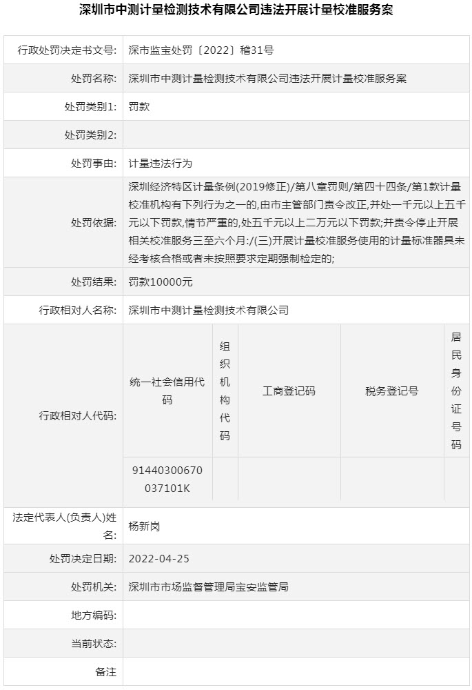 近日,深圳市市场监督管理局对3件违法案例进行通报。其中,深圳市中量检测技术有限公司因计量违法行为被罚1000元,深圳市中测计量检测技术有限公司因计量违法行为被罚10000元,中首检(深圳)珠宝检测有限公司因超出资质认定证书规定的检验检测能力范围向社会出具具有证明作用数据、结果被罚30000元。案件详情如下: