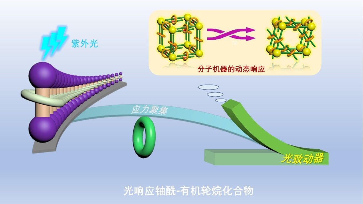 “我们在前期锕系-有机轮烷配合物研究的基础上,首次将具有光二聚活性的葫芦脲主客体体系引入到铀酰-轮烷结构中,成功构筑了一例新型光活性锕系聚轮烷材料,并实现了该材料在紫外光照射下的可控宏观力学响应。”梅雷说。