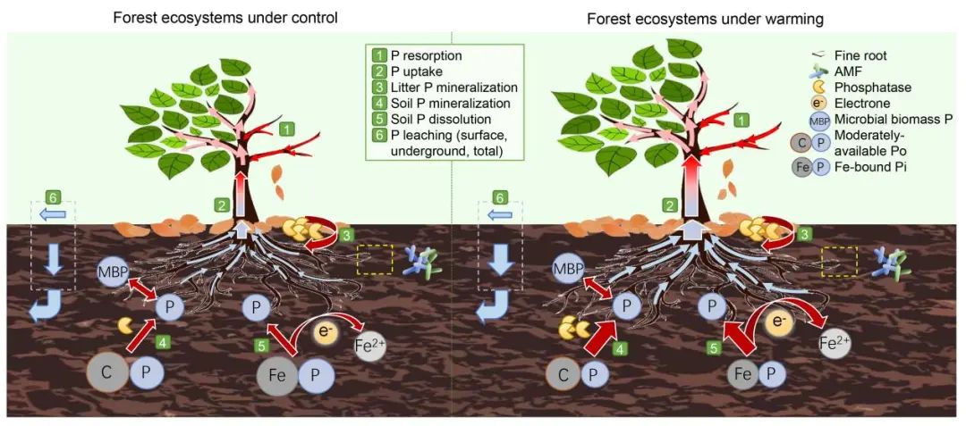 华南植物园鼎湖山站刘菊秀研究团队基于鼎湖山站的长期自然增温平台,系统地评估了7年增温对热带森林生态系统磷循环的影响。研究发现,在磷匮乏生态系统中,增温可维持植物加速生长的磷需求。增强的植物磷需求主要通过增强生态系统内部生物化学过程(如植物磷重吸收、土壤磷矿化和磷溶解)以增加磷供应来满足,而不是通过影响磷通量(如凋落物磷矿化和磷的径流和淋失损失)和改变更耗能的途径(如增强细根和菌根真菌)来实现。结果表明,以往短期实验或利用单一的磷供应评估方法的研究,可能高估了至少在短期或中长期增温背景下磷限制对生态系统碳储量的负反馈。研究结果扩展了对气候驱动的养分需求/供应假说的理解,提出了增温背景下维持植物高磷需求的多种磷获取策略,拓展了传统的评估方法(仅通过有效磷评估磷供应)和理论(仅通过土壤磷矿化评估磷转化),为增进磷调控热带森林碳汇功能响应增温的认识提供了重要的线索,为急需改善的地球系统模型提供了新的思路。