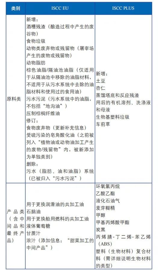 ISCC认证涵盖所有类型的可持续性原料,包括生物质材料、可再生能源和循环材料。为适应RED II的修订以及认证材料的不断增加,ISCC体系内也在不断更新和补充,部分典型的更新材料如附表所示。