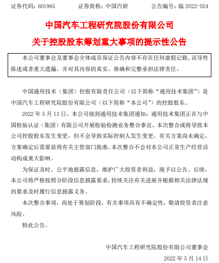 5月14日,中国汽车工程研究院股份有限公司(中国汽研)发布《关于控股股东筹划重大事项的提示性公告 》。公告称,2022年5月13日,中国汽研控股股东中国通用技术(集团)控股有限责任公司(以下简称“通用技术集团”)正在与中国检验认证(集团)有限公司开展检验检测业务整合事宜,本次整合或将导致公司控股股东发生变更,但不会导致实际控制人发生变更。有关方案尚未确定,方案确定后需要获得有关主管部门批准。本次整合不会对公司正常生产经营活动构成重大影响。