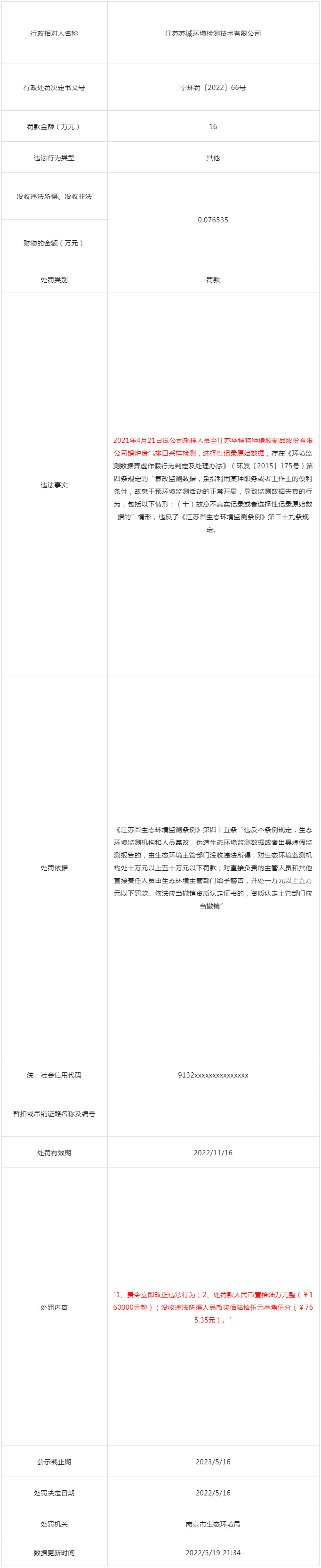 据南京生态环境局官网通报,近日,江苏苏诚环境检测技术有限公司因选择性记录原始数据被责令立即改正违法行为,罚人民币16万元,并没收其违法所得765.35元。