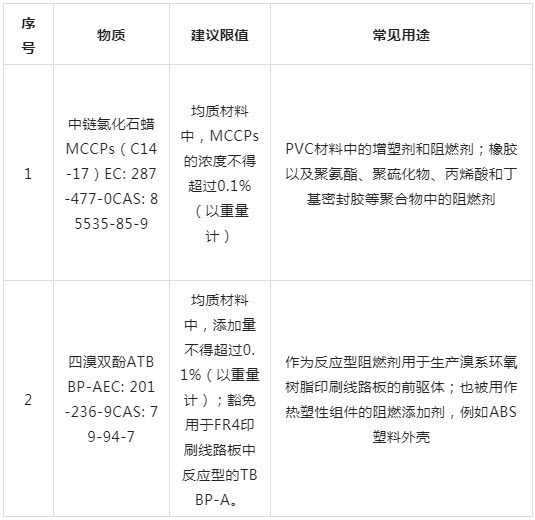 早在2021年3月,Oeko-Institut e.V.就已发布了Pack 15最终评估报告,报告中对包含四溴双酚A(TBBP-A)和中链氯化石蜡(MCCPs)在内的7项物质进行了评估,最终推荐将四溴双酚A(TBBP-A)和中链氯化石蜡(MCCPs)纳入RoHS的附录II限制物质清单中,原因是这两种物质对工人、消费者以及环境存在重大暴露危害的风险。物质常见用途及当时评估报告中建议的限值如下表: