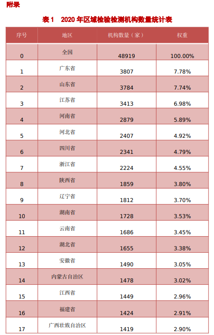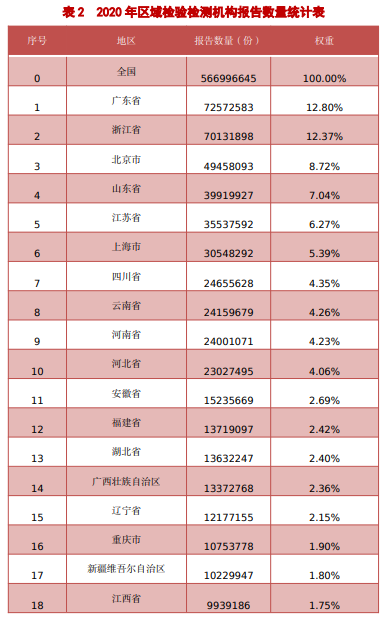 附:2020年各地区检验检测机构数量及报告数量统计表(来源:认监委)