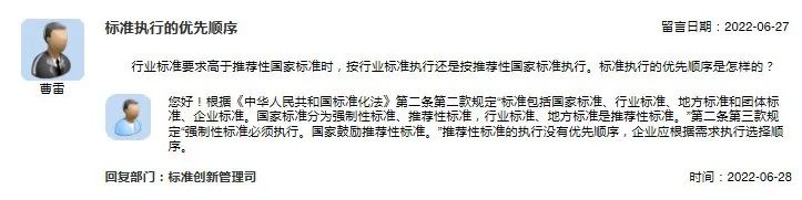 近期,有网友在市场监管总局网站公众留言系统咨询“标准执行的优先顺序”,市场监管总局标准创新管理司给予了答复。