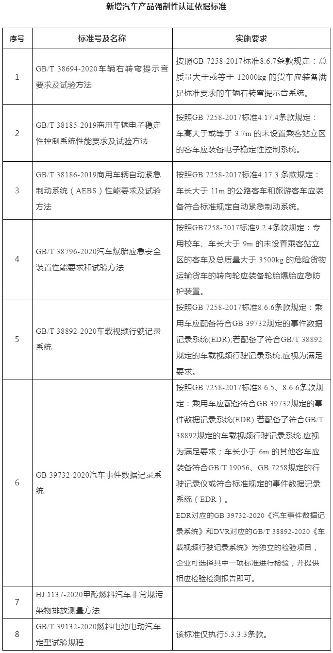一、自本公告发布之日起,《强制性产品认证实施规则-汽车》(CNCA-C11-01:2020)中的认证依据标准(以下简称现有标准)增加本公告附件所列8项标准。