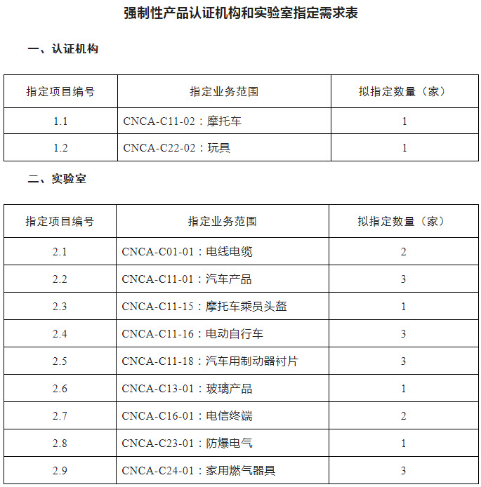 按照公正公开、择优使用的原则,拟指定机动车辆及安全附件、玩具、电信终端、家用燃气器具等产品领域认证机构2家次,实验室19家次。(指定需求详见附件)