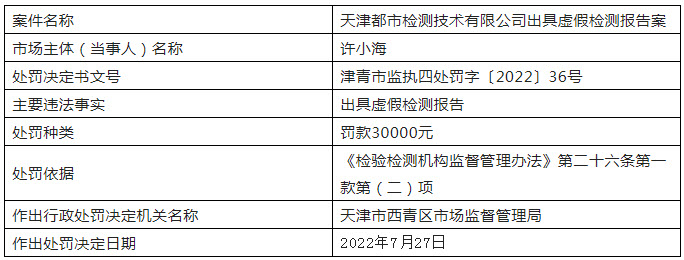 7月28日,天津市西青区市场监管局网站公布一则行政处罚信息,涉及天津都市检测技术有限公司出具虚假检测报告案。