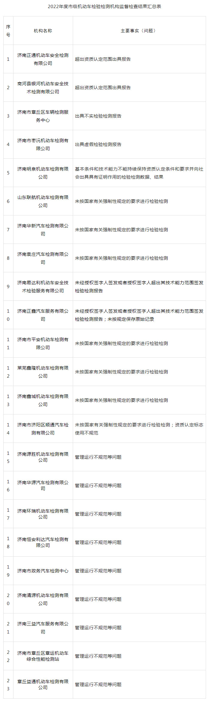 通报显示,为加强对资质认定检验检测机构的监管,营造公平有序的市场环境,根据《山东省市场监督管理局关于做好2022年山东省资质认定检验检测机构监督检查工作的通知》《济南市市场监管局关于做好2022年资质认定检验检测机构监督检查工作的通知》等有关要求,济南市市场监管局组织完成了2022年度市级机动车检验检测机构监督检查工作。现将有关情况通报如下: