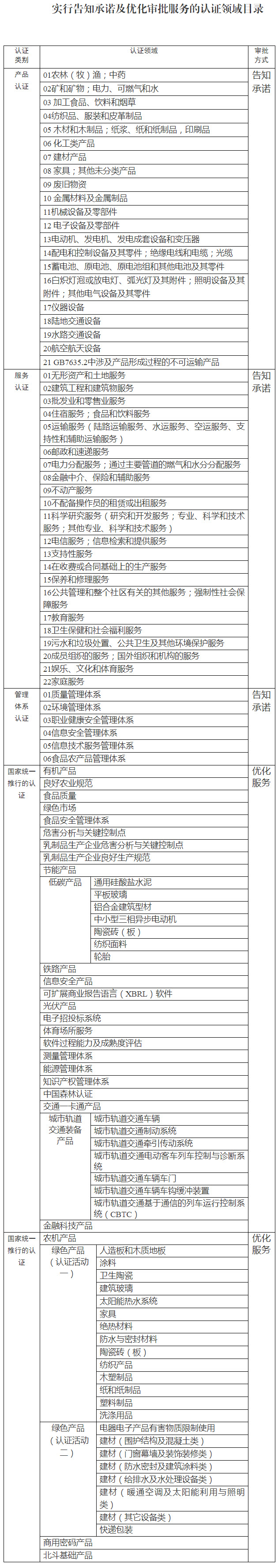 附件:1. 实行告知承诺及优化审批服务的认证领域目录