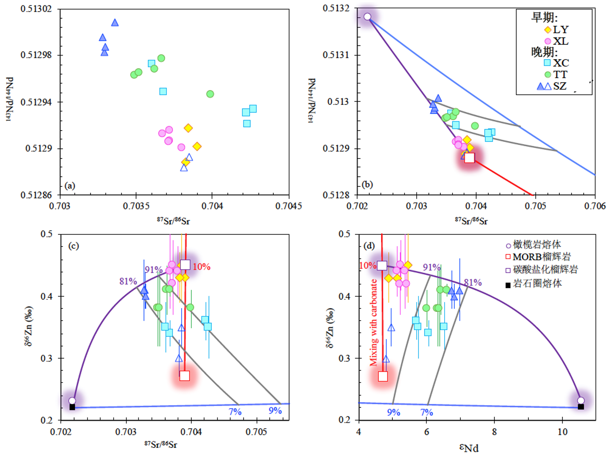 图1 浙江新生代高Mg玄武岩的Zn-Sr-Nd同位素组成。红线表示MORB榴辉岩与碳酸盐组分混合形成碳酸盐化榴辉岩。紫线是亏损地幔橄榄岩熔体与碳酸盐化榴辉岩组分的混合曲线。蓝线是岩石圈熔体与全球俯冲沉积物组分的混合曲线。灰线表示软流圈组分与经历过俯冲改造的岩石圈组分之间的混合(据Xu et al., 2022修改)。