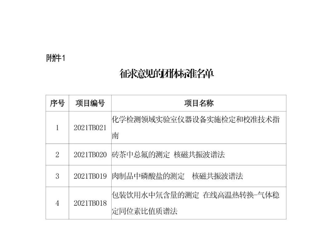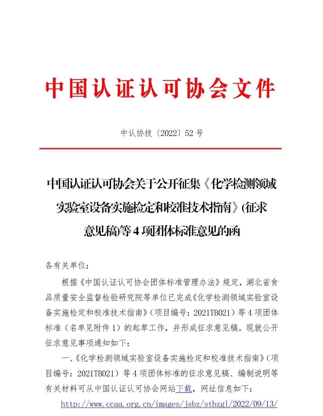 近日,中国认证认可协会发布通知,根据《中国认证认可协会团体标准管理办法》规定,《检验检测人员监督和监控实施指南》(项目编号:2022TB001)、《检验检测机构检测方法开发指南》(项目编号:2022TB002)、《化学检测领域实验室设备实施检定和校准技术指南》(项目编号:2021TB021)等 6 项团体标准的起草工作已完成,现正公开征求意见,详情如下:
