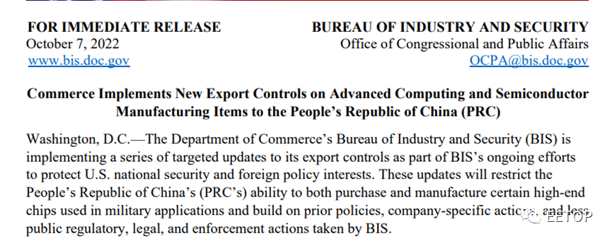美国商务部7日宣布一系列芯片出口管制措施,未来美国企业除非获得政府许可,否则不得出口先进芯片和相关制造设备至中国大陆;运用美国技术、在他国制造的芯片,也将受此规范。