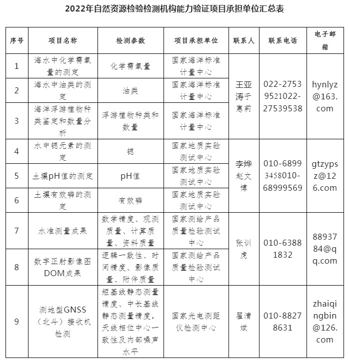 近日,自然资源部、 国家市场监督管理总局联合发布通知,组织开展2022年自然资源检验检测机构能力验证工作,本次能力验证计划项目共9项。详情如下:
