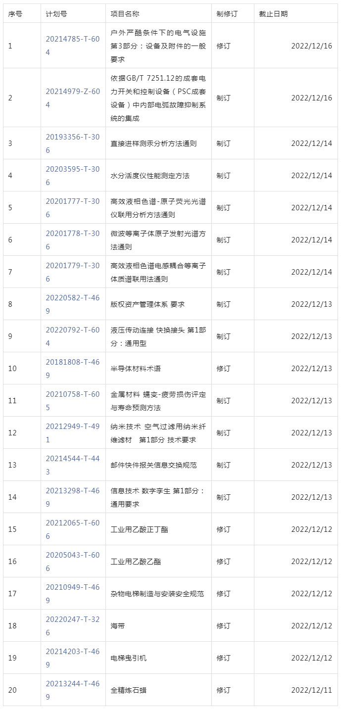 日前,20项推荐性国家标准(征求意见稿)在全国标准信息公共服务平台公开征求意见,社会各界人士可登录全国标准信息公共服务平台的推标草案征求意见栏目反馈意见。