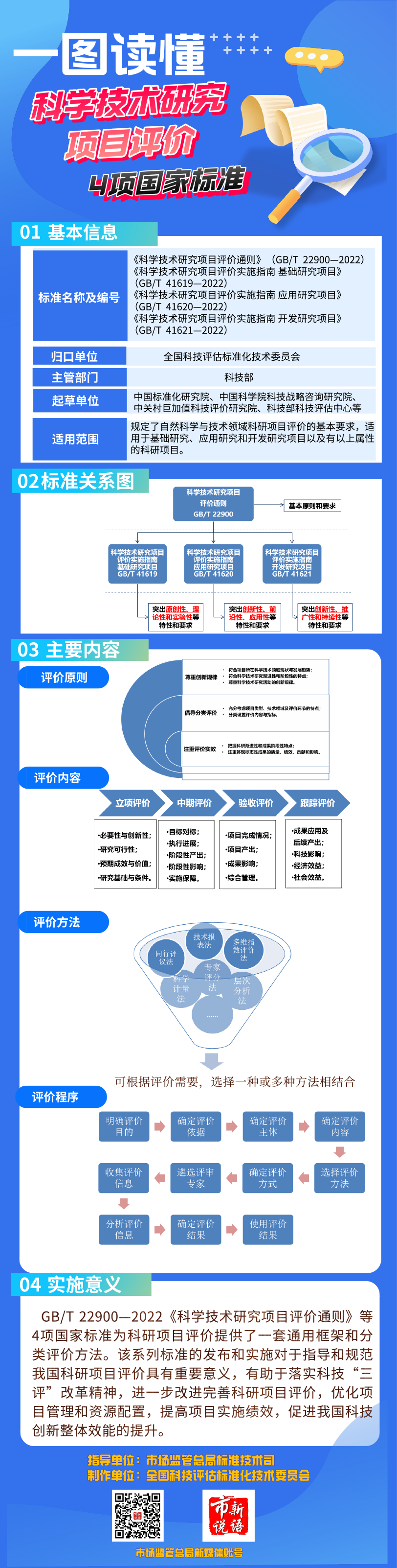 近日,市场监管总局(标准委)批准发布新版《科学技术研究项目评价通则》国家标准(GB/T 22900—2022),以及《科学技术研究项目评价实施指南 基础研究项目》(GB/T 41619—2022)、《科学技术研究项目评价实施指南 应用研究项目》(GB/T 41620—2022)和《科学技术研究项目评价实施指南 开发研究项目》(GB/T 41621—2022)共4项推荐性国家标准,为科研项目评价提供了一套通用框架和分类评价方法。该系列标准由科技部提出,全国科技评估标准化技术委员会(SAC/TC580)归口,中国标准化研究院、中国科学院科技战略咨询研究院、中关村巨加值科技评价研究院、科技部科技评估中心等单位共同起草。