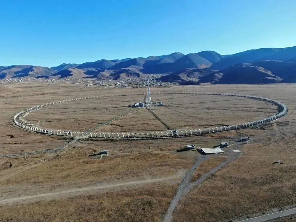 距离稻城县城不到10公里,与皮洛旧石器时代遗址遥遥相望,在海拔3830米的甘孜州稻城县噶通镇,科幻片一样的场景变成了现实——群山环抱间,313台6米直径、形似锅盖的天线,围成了直径1公里的圆环阵。最中间,100米高的定标塔,为射电望远镜的313套天线及接收提供基准信号。