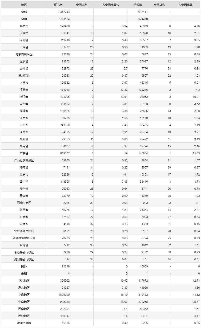 截至2022年11月,我国有效认证证书数为326万张,获证企业数为92万家。其中证书数10万以上的省、市10有个,分别为广东619577张、江苏434348张、浙江424206张、山东243360张、上海129332张、北京128488张、安徽114493张、四川113608张、河北113416张、福建109525张。
