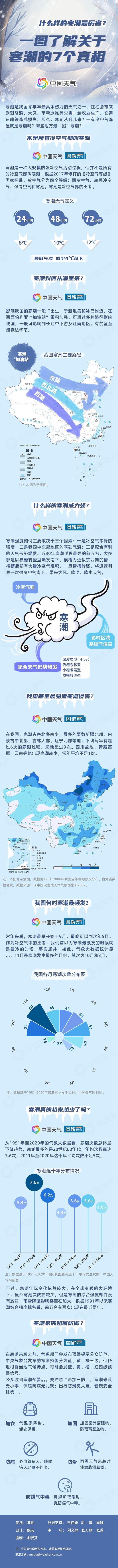 寒潮是我国冬半年最具杀伤力的天气之一,往往会带来剧烈降温、大风、雨雪冰冻等灾害,给农业生产、交通运输等造成损失。那么,寒潮从哪儿来?一有冷空气降温就是寒潮吗?哪些地方最“招”寒潮?一图了解关于寒潮的7个真相。