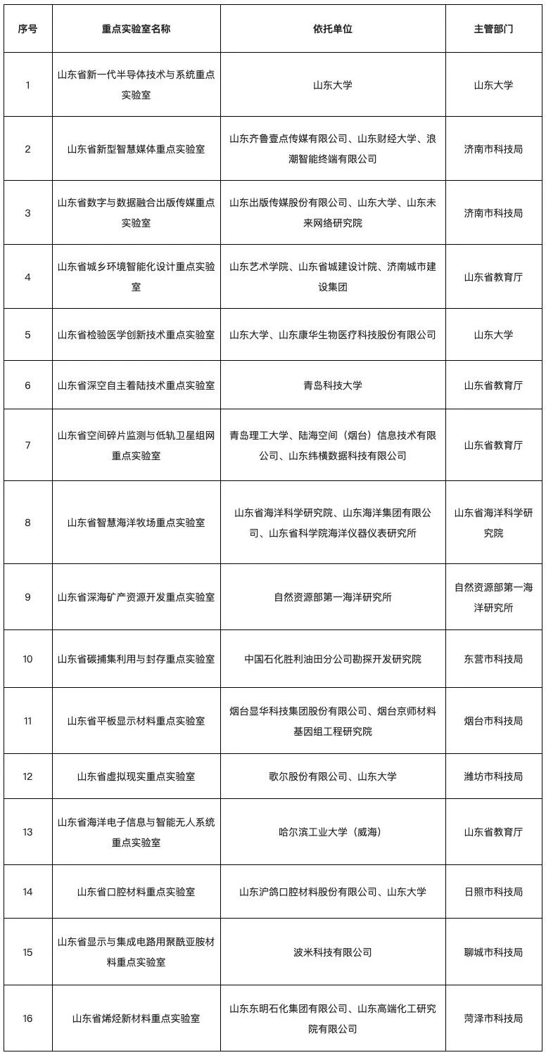 新批建设的山东省重点实验室名单(共16家)