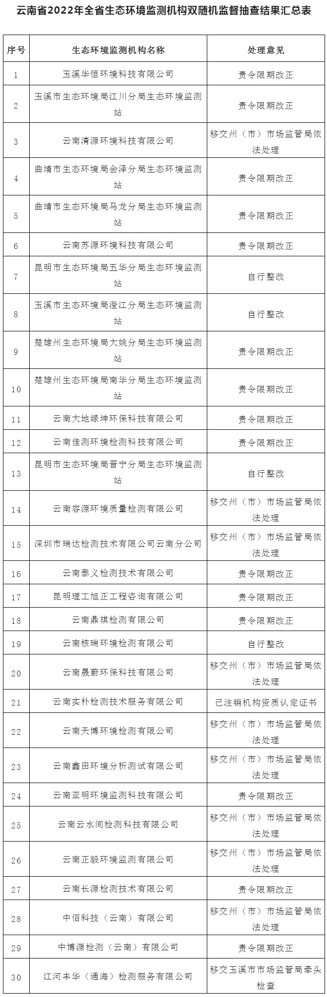 近日,云南省生态环境厅 云南省市场监督管理局对2022年全省生态环境监测机构监督抽查情况进行了通报,检查的30家生态环境监测机构中,9家机构在管理和技术方面涉嫌存在违法违规问题,移交州(市)市场监督管理局依法调查处理。详情如下: