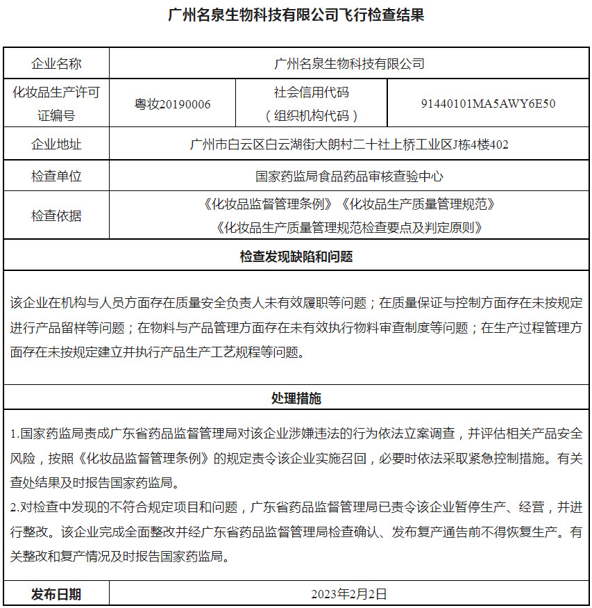 国家药监局关于广州名泉生物科技有限公司等企业飞行检查结果的通告