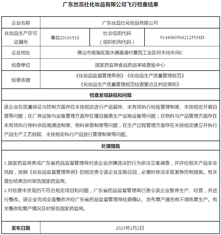 2.广东丝蕊社化妆品有限公司飞行检查结果