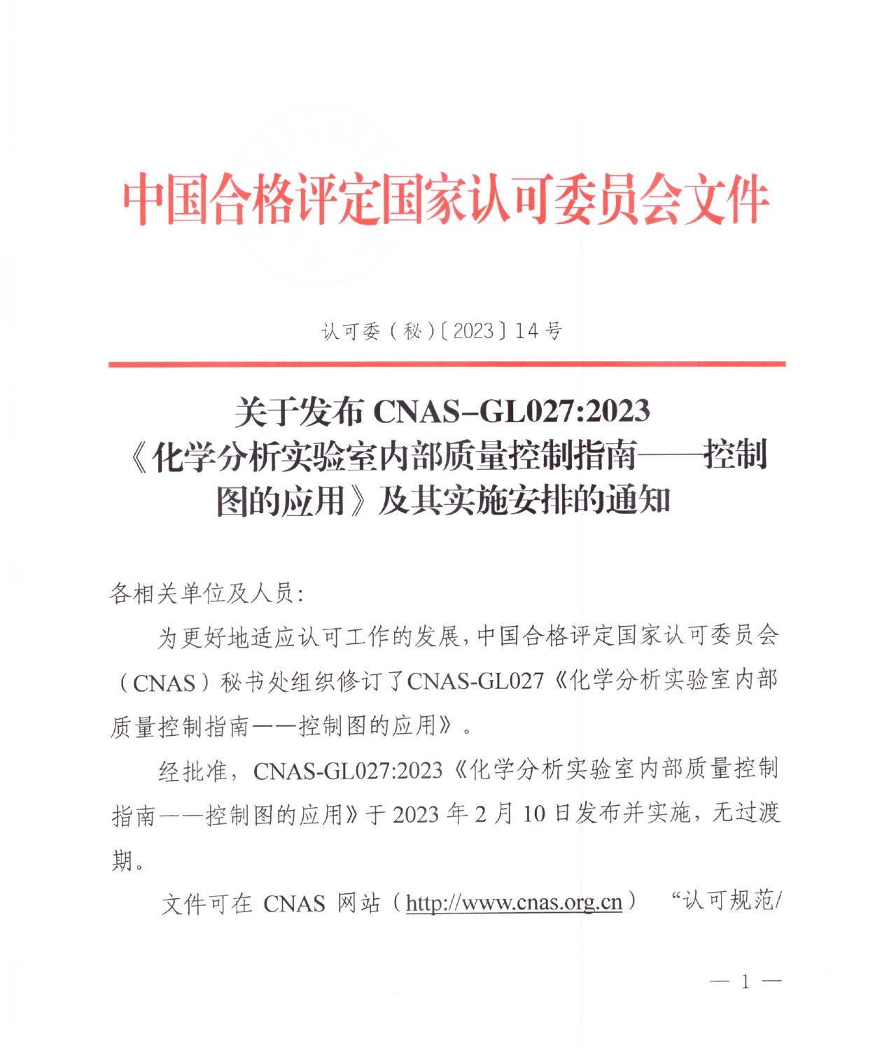 近日,中国合格评定国家认可委员会(CNAS)发布通知,《化学分析实验室内部质量控制指南——控制图的应用》于2023年2月10日发布并实施,无过渡期。详情如下: