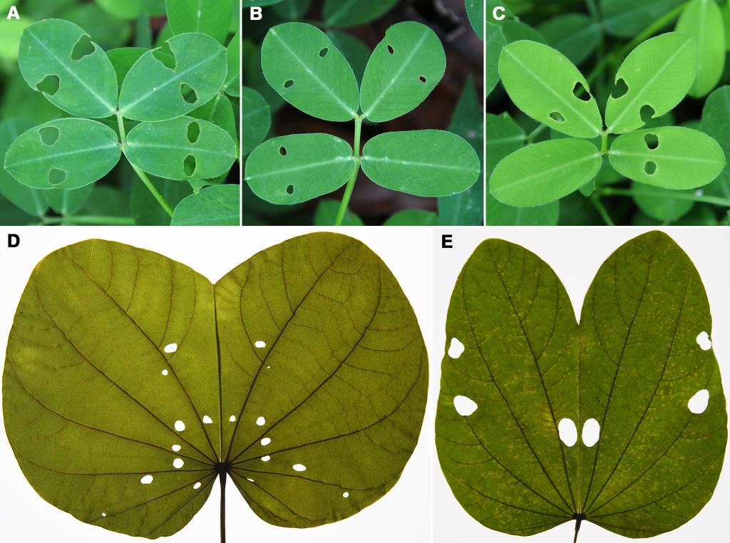 现生植物叶片在夜晚合拢后被咬出的“虫眼”。(冯卓 摄)
