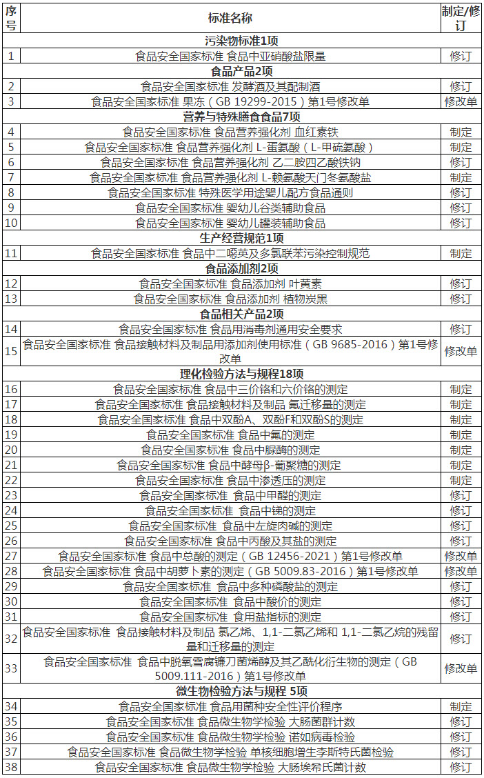 这些国家标准涉及污染物标准1项,食品产品2项,营养与特殊膳食食品7项,生产经营规范1项,食品添加剂2项,食品相关产品2项,理化检验方法与规程18项,微生物检验方法与规程5项。
