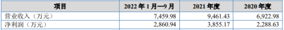 公告显示,北矿检测2020年度、2021年度、2022年1月~9月营业收入分别为6,922.98万元、9,461.43万元、7,459.98万元;净利润分别为2,288.63万元、3,855.17万元、2,860.94万元。
